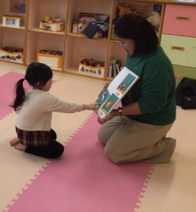 耳を澄ませて英語を聞き、「これ!」と嬉しそうにカードを指差す子どもたちです
