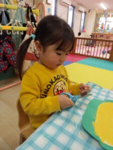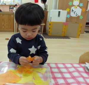 今週は2月の製作のシチュー作りやひな祭り製作をしました。シチュー作りで2歳児はハサミを使い色画用紙を切りました。慎重な表情でチョキチョキと切っていましたよ。ひな祭り製作はお花紙をビリビリと割いたりしました。さて、どんなかわいい作品が出来上がるでしょうか・・?楽しみにしていてくださいね!